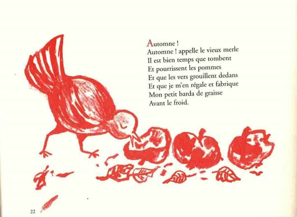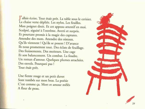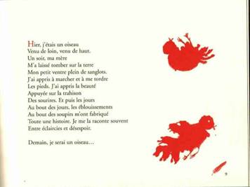 L’intérêt particulier de ce  recueil de belle facture avec ses illustrations stylisées au trait rouge, jouant sur les vides et les pleins sur fond beige, se trouve dans l’analogie entre l’enfant et l’oiseau dès la page de garde46 et surtout dans le poème liminaire :