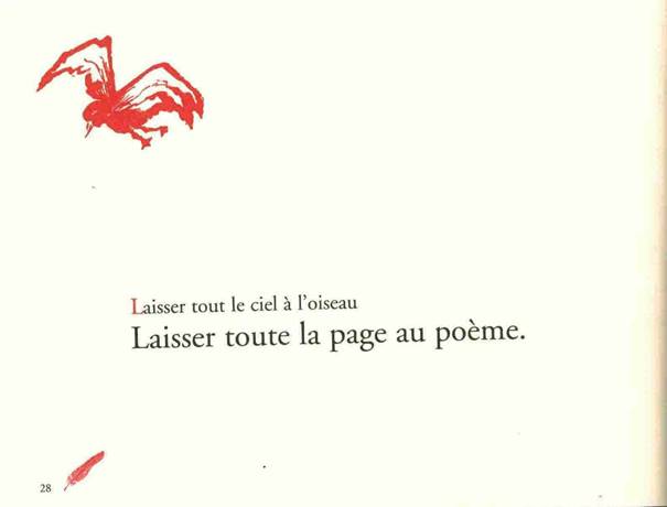 Illustration 22. Joelle Brière, Du sel dans les yeux : petits dits d’oiseaux, Éd. La Renarde Rouge, 2006 : poème et illustration p. 28 (« Laisser tout le ciel à l’oiseau / laisser toute la page au poème »)