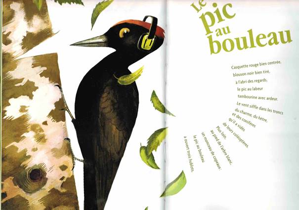 Illustration 26. Françoise Bobe, ill. Nicolas Duffaut, La pie-poète, Bayard jeunesse, 2009 : « Le pic au bouleau », p. 8-9