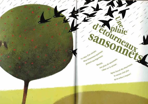 Illustration 27. Françoise Bobe, ill. Nicolas Duffaut, La pie-poète, Bayard jeunesse, 2009 : « Une pluie d’étourneaux sansonnets » p. 18-19