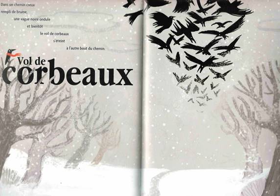 Illustration 28. Françoise Bobe, ill. Nicolas Duffaut, La pie-poète, Bayard jeunesse, 2009 : « Le vol de corbeaux » p. 30-31
