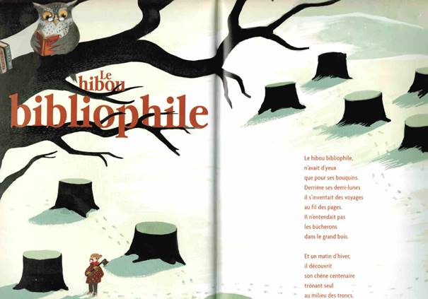 Illustration 29. Françoise Bobe, ill. Nicolas Duffaut, La pie-poète, Bayard jeunesse, 2009 : « Le hibou bibliophile », p. 23-24