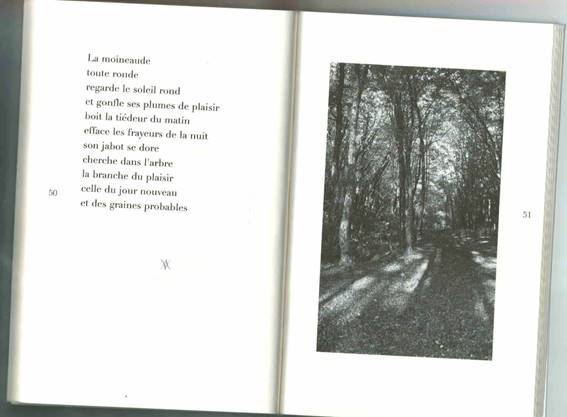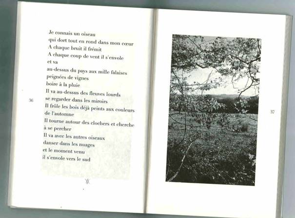 Un poème à la page 50 associe l’oiseau à un « cahier de vraies vacances », « que personne ne corrigera » et « qu’on oubliera exprès / Sous un arbre du jardin ». Le thème de la liberté et le motif du vol ou de l’envol sont d’ailleurs récurrents49. Or parallèlement, est aussi établi de manière récurrente tout un jeu de miroir entre l’oiseau et le poème ou l’écriture poétique, déjà présent dans le recueil de Michel Besnier :