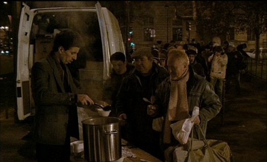 Pour revenir à cette séquence, il faut également souligner combien l’effet Babel que produit ce moment du film n’est pas simplement lié au fait qu’il donne à entendre une multitude de langues mais qu’il les donne à entendre comme se déployant au sein d’un espace dont il fait un lieu bien délimité. Pour commencer, les plans sur la distribution de la soupe, bien que filmés en extérieurs, offrent au regard bien peu d’ouverture sur le contexte urbain dans lequel s’inscrit la scène (ill. 1). Non seulement la nuit y resserre l’espace visuel, mais l’arrière-plan reste souvent flou. La ville est en quelque sorte mise à distance, alors même que sur le plan sonore la rumeur urbaine situe l’action dans un quartier du centre. Est ainsi isolé en son sein un espace autre, une hétérotopie pour reprendre le terme de Foucault2 : celle d’un square parisien qui se fait le lieu d’une certaine élaboration du Monde. Cette dimension se montre d’autant plus présente dans le film que cet ici, avant même d’être exploré par la caméra, est connecté avec un ailleurs par la musique. En effet, des sonorités venues de loin emplissent la bande-son, qui adopte le point d’écoute du personnage principal, casque audio sur la tête.
