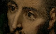 Qu’il s’agisse d’un moment de passage au sens fort est également appuyé par la tonalité étrange dans laquelle bascule le récit : les regards convergent curieusement vers le personnage et, semblant le reconnaître, toutes et tous lui indiquent spontanément la direction à suivre, vers une destination inconnue de lui. Le principe d’incertitude fantastique qui caractérise son arrivée à Tolède se confirme jusque dans le musée où il aboutit. Le spectateur assiste alors à de sidérants face-à-face en champs-contrechamps : devant les portraits des apôtres peints par Le Greco, le personnage fait l’expérience d’une familiarité soudaine et inattendue. Mieux, il se reconnaît. Il est donc question assez explicitement, ici, de l’identité du sujet (ill. 7 et 8). Si, dans l’économie d’ensemble du film, cela vient faire écho notamment à une scène placée bien avant où un personnage d’amnésique disait l’étrangeté ressentie face à son image dans le miroir, il importe surtout pour notre propos de relever combien cette séquence tolédane introduit ainsi à un dépaysement d’un autre ordre, qui ne renvoie pas à une situation de fait mais se présente comme un processus, et plus spécifiquement comme un processus d’individuation. Ce second dépaysement, le film va lui donner forme en changeant profondément les données du rapport entre la figure et le fond.