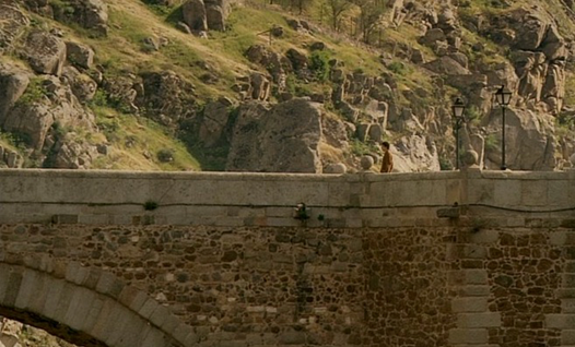 La séquence de Tolède constitue un moment de bascule dans le film et le plan sur lequel s’ouvre celle qui suit vient aussitôt le confirmer. Sans plus de transition qu’un montage cut, nous y considérons le personnage de Yacine tandis qu’il marche, seul, sur un pont en pierre de facture ancienne (ill. 9). Jamais depuis le début du film, alors même que celui-ci s’achèvera à peine quelques minutes après, le personnage n’a été filmé au sein d’un plan si large. Pour la première fois aussi, le montage présente de façon suivie l’avancée du personnage dans une succession de plans, que ce soit avec un enchaînement de panoramiques comme ici ou à travers une série de travellings latéraux à travers le palais de l’Alhambra comme dans la scène suivante – où l’on retrouve par ailleurs, cela mérite d’être signalé, le motif de l’espace transitionnel et plus spécifiquement du tunnel par une utilisation répétée et insistante du contre-jour.